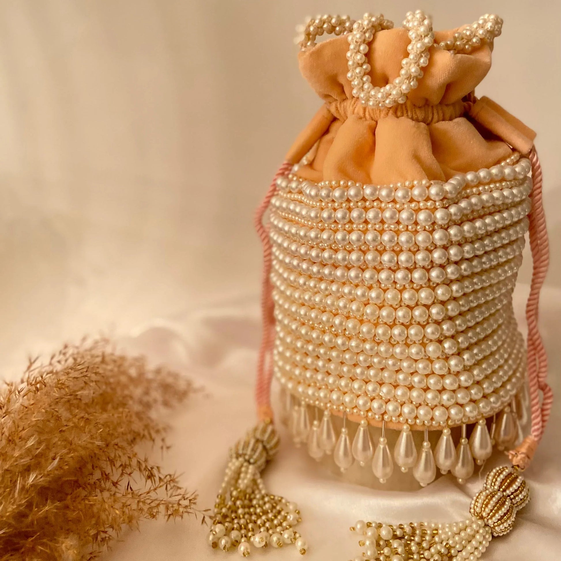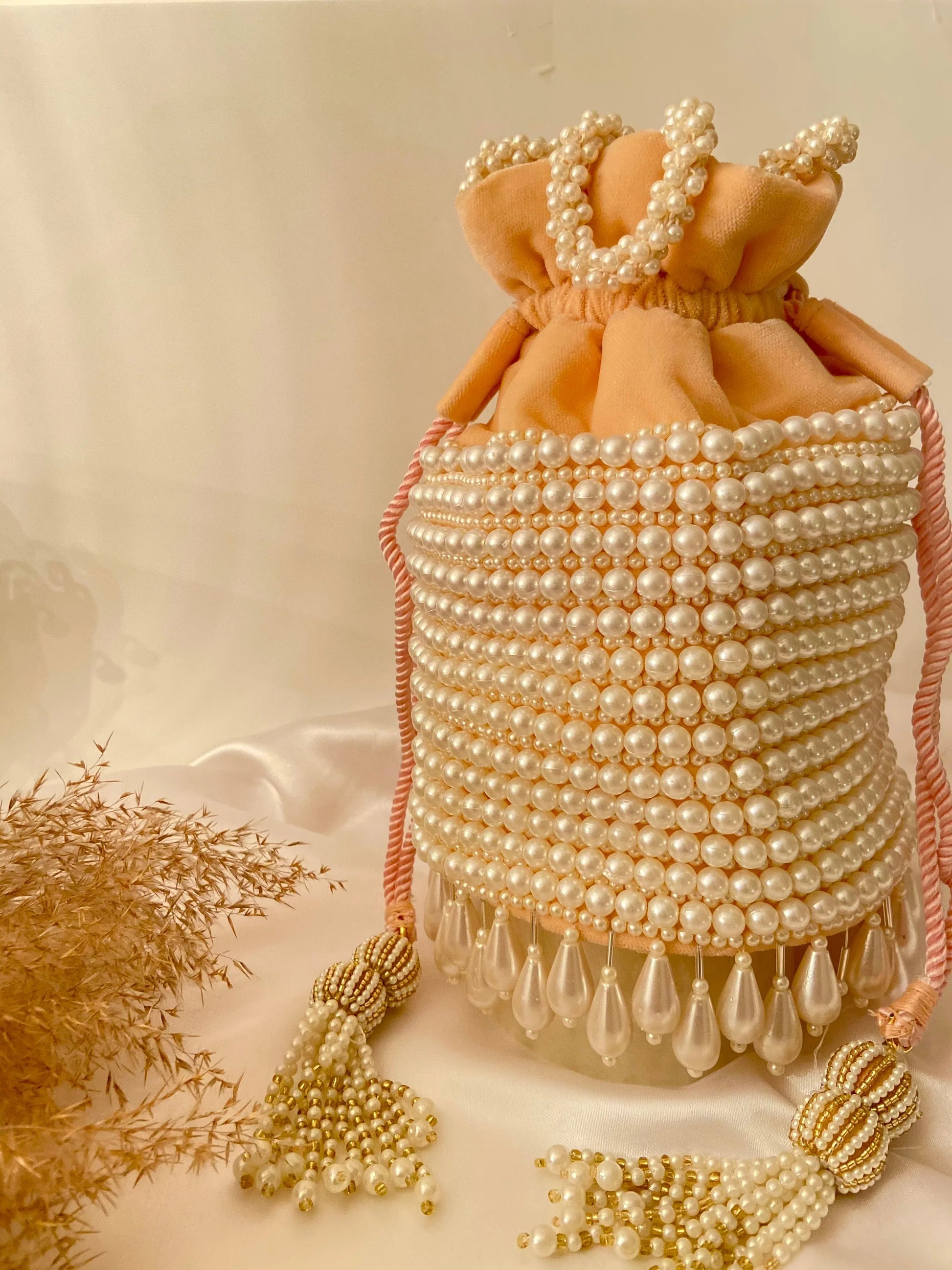 A luxurious detailed pearl potli bag crafted on a velvet fabric embellished with Pearls all over. Her elevated beauty is with her pearl tassels reflecting her delicacy. Fine details include silk ties with tassel and a pearl wrist handle.